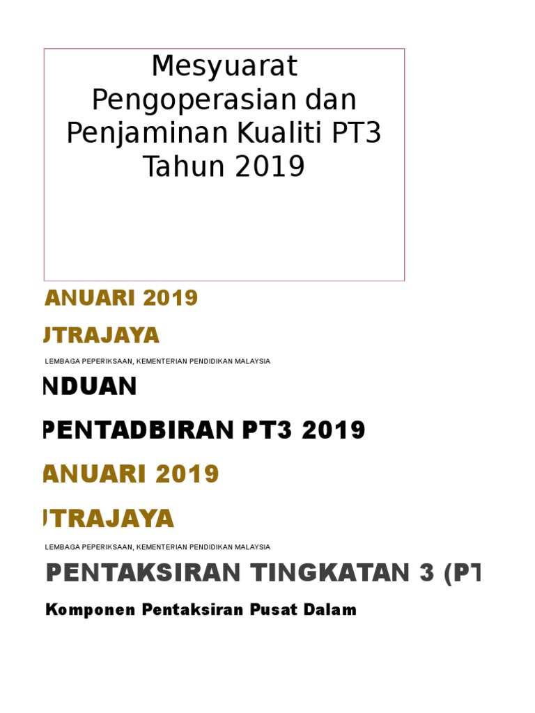 Panduan Pengurusan dan Pentadbiran Pentaksiran Sumatif PT3 Tahun 2020 pada 2020-07-13. Daftar MP mengikut kelompok pakej yang ditawarkan sebagaimana yang dinyatakan dalam Panduan Pengurusan dan Pentadbiran PT3. Format Instrumen Pentaksiran Tingkatan 3 PT3 bagi Mata Pelajaran Bahasa Inggeris Mulai 2019.