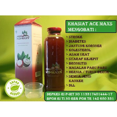 Ace Maxs tergolong obat herbal multikhasiat kelas premium yang telah terdaftar di Dep Kes RI P-IRT No113317401444-17. Ditambah dengan ekstrak daun sirsak yang sangat terkenal dengan khasiatnya mengusir kanker dan berbagai penyakit lainnya. Sekarang masyarakat malaysia bisa mendapatkan produk kesehatan asli indonesia yang terbuat dari ekstrak kulit manggis daun.